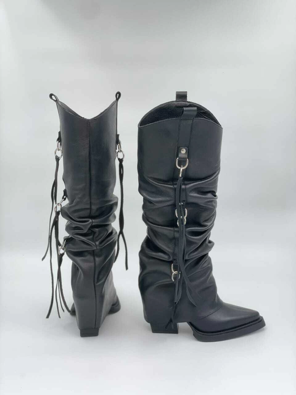 Botas tipo texana de caña alta en cuero.Su terminación en punta y los detalles en cadena le aportan un estilo único y sofisticado. El taco de madera antideslizante no solo brinda una altura ideal, sino que también garantiza seguridad en cada paso. Estas botas son perfectas para realzar cualquier outfit, ya sea casual o formal.